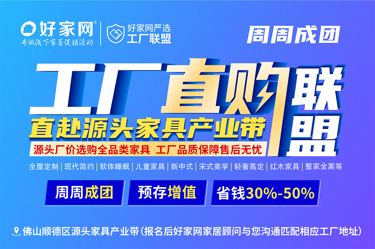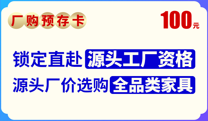 严选优质工厂,工厂直购品质保障,省钱30%-50%,100元预存卡可增值至1000元,全品类各风格家具一应俱全,优惠尽在直赴佛山顺德源头家具工厂 厂价选购全品类家具,赶紧与亲戚朋友一起报名参加吧!